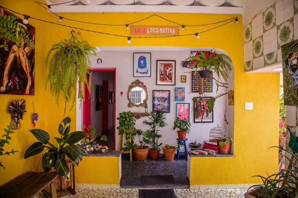 O ateliê onde tudo acontece, o café onde fazemos as pausas para comer alguma coisa gostosa e relaxar, a sala com puffs e sofás para curtir os quadros, o nosso corredor cheio de plantas, o muro com tags, lambes e grafittis de vários artistas que já passam por lá e uma baita vista para o pôr do sol.